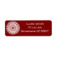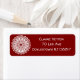 Estas etiquetas de dirección devueltas tienen un diseño mandala simple hecho de líneas, curvas y formas en rojo profundo sobre un campo de blanco.