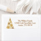 Una etiqueta de la dirección de retorno de la tarjeta de Navidades de guión dorado de moda con el nombre de su familia bajo hermosos árboles hechos de copos de nieve dorados sobre Feliz Navidad. Etiquetas vacacionales de moda con un diseño artístico.