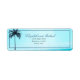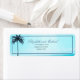 Un elegante rótulo personal en color azul y blanco Palm Tree. En un fondo acuático, una palmera elegante domina los nombres. La información se cambia fácilmente a la tuya. El guión moderno se cambia fácilmente para su propia información personalizado. El sello personalizado está solo, aunque forma parte de una suite de bodas estacionaria en Just Fine Designs. Ver la colección a través del enlace de esta página .
