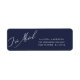 Vestir sus Invitaciones en movimiento con nuestras modernas etiquetas de dirección de retorno con un elegante tipo de letra caligráfica en un fondo azul marino. Invitaciones móviles coincidentes disponibles en nuestra tienda. Este artículo está disponible en una gran variedad de combinaciones de colores.