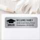 El diseño moderno de la etiqueta de dirección personalizado incluye una tapa de grad negro con tassel, año de clase, texto de dirección de retorno y un brillante fondo impreso digitalmente de plata que se puede personalizar para que coincida con cualquier color de escuela o invitación.