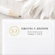 Esta sencilla etiqueta de dirección de retorno incluye un monograma dorado para dos iniciales. El monograma se acentúa con un gráfico geométrico dorado.