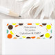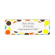 Estas etiquetas de dirección devueltas tienen un diseño geométrico de puntos azules, naranjas, amarillos y marrones.