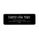 Estas etiquetas de dirección de retorno mínimas dicen "Feliz Año Nuevo" en un fondo negro, con tipografía blanca moderna y caprichosa.