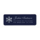 Una elegante etiqueta de dirección de regreso azul marino y plateado, recomendada para la tarjeta de saludo de las fiestas de invierno. Tiene un copo de nieve de lámina plateada falsa a la izquierda y texto gris claro a la derecha. El nombre está escrito en una caligrafía elegante, la dirección en mayúsculas más pequeñas. Se puede utilizar para una tarjeta de Navidad o Año Nuevo. El fondo es azul marino.