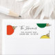 Un diseño moderno de tarjetas de vacaciones con 3 adornos de estilo retro en rojo, verde y amarillo alrededor de un domicilio personalizado. Diseño de Shelby Allison y foto de Joseph Gonzalez en Unsplash