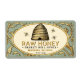 Ropa vintage de gradiente dorado y abejas con un elaborado borde dorado y verde. Conversiones comunes de peso neto de miel: 8 oz (227 g), 12 oz (340 g), 16 oz (454 g), 32 oz (907 g), 5 lb (2,27 kg).
