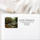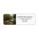 Etiquetas de direcciones con una fotografía de naturaleza. Moody y bello paisaje. Un puente de piedra aislado al lado de un animado río con un bosque y montañas que rodean la zona.