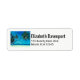 Etiquetas de direcciones con una foto tropical temática con cocoteros extendiéndose por un cielo azul.