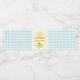 ¡Un pato afortunado! Primer cumpleaños con un pato de caucho y burbujas contra un gingham azul claro y fondo amarillo pálido con texto naranja