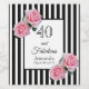 Una etiqueta para un fiesta de 40 años. Rayas verticales clásicas delgadas en blanco y negro como fondo. Con rosas rosas rosa femeninas y femeninas como decoración. Un marco delante Con el texto: 40 y Fabulous y plantillas para el nombre y la fecha.