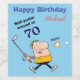 Esta etiqueta personalizada de botellas de vino es un regalo divertido para un golfista que está convirtiendo a los 70 grandes. Incluye el texto personalizado en texto estilizado rojo, azul y negro. Actualmente dice "Todavía tengo 70". Un golfista personalizado le está dando un golpe a su bola al lado del texto. Agrega tu mensaje de cumpleaños y nombre. La imagen y el texto se colocan sobre un fondo azul brillante. *Este diseño utiliza la imagen © Graphics Factory.com*