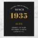 1935 Vintage 90th Birthday Black & Gold Elegant Wine Label. Celebra tu hito con nuestra exclusiva etiqueta de vino de cumpleaños. La etiqueta de diseño meticuloso con sorprendentes tonos negros y dorados mejora sin esfuerzo el atractivo visual de su vino favorito. El año que se destaca en la etiqueta, agrega un retroceso nostálgico al día de tu nacimiento. Utilizando material de primera calidad, esta etiqueta garantiza la longevidad, consolidando aún más su lugar como un recuerdo memorable de su celebración especial de cumpleaños. Además, disfrute de la ventaja de personalizar esta etiqueta con su nombre, añadiendo un toque único e íntimo a su celebración. ・ Impresionante Diseño Negro y Oro: Infunde un aura de sofisticación y elegancia a cualquier botella de vino, convirtiéndolo en el centro perfecto para su celebración ・ Año Destacado: Agrega un toque nostálgico, haciendo que se sienta especial en su cumpleaños de hito ・ Material de alta calidad: Asegura que la etiqueta del vino resiste la prueba del tiempo, evolucionando en un recuerdo memorable que apreciará ・ Completamente personalizado: Añada su nombre etiqueta para un toque íntimo y único a sus celebraciones ・ Fácil de aplicar: la parte posterior de la etiqueta es autoadhesiva, lo que garantiza una aplicación sin complicaciones en su botella de vino