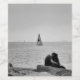 Joven pareja sentada en las rocas por el Bósforo. Concepto de amor. Captura de imagen en el barrio llamado Moda, ubicado en el lado asiático de Estambul. Un velero es el fondo.