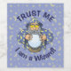 Viejo mago con capa azul mirando la bola mágica de cristal.