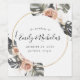 Elegantes etiquetas tropicales de boho floral con tus nombres y fecha boda rodeadas de un falso marco de círculo de Relieve metalizado dorado adornado con hojas de monstera color agua, orquídeas y peonías rosadas. Coordenadas de diseño con nuestra colección Boho Tropical Floral boda.