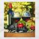 Dos elegantes vasos de vino llenos de rico vino tinto se sientan al lado de una botella rodeada de frutas exuberantes.