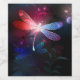 Flor, vuelo, libélula roja, con alas transparentes y detalladas sobre fondo oscuro, nocturno y luminoso con plantas tropicales y luciérnagas. Lluvia roja.