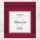 Etiquetas personalizadas para la elaboración de botellas con un fondo rojo, decoradas con elegantes remolinos y diseños ornamentales a lo largo de las fronteras. Un marco cuadrado sobre la parte superior con el texto dentro.