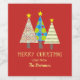 Sencilla, moderna, roja, etiqueta de vino Feliz Navidad para regalos familiares y amigos, con coloridos pinos y moderna caligrafía.