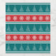 Feliz ilustracion navideño con árbol de Navidad y decoración de copos de nieve sobre fondo rayado rojo, blanco, azul y turquesa