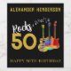 Añadir nombre personalizado Rocks 50 tipografía moderna de oro 50 cumpleaños etiquetas de vino con notas musicales y tres diseños de guitarra psicodélicos y coloridos sobre fondo negro. Guitarra eléctrica, guitarra acústica y ilustracion artístico de guitarra acústica en colores brillantes. Esta plantilla fácil de usar para cambiar la edad y el nombre crea la etiqueta fiesta perfecta para celebrar los cincuenta en estilo rock n roll y es ideal para un guitarrista, músico y amantes de la música. Este moderno diseño musical de instrumentos musicales celebra la energía musical de este maravilloso instrumento musical y es la manera perfecta de rodar una celebración de 50 años. Pintura original de la artista Catherine Sweetman