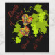 Clásico sello negro con una vid de uva verde brillante, también dos corazones compuestos de todas las frutas diferentes y escrito en un guión rojo de fantasía, "Botella de vino, fruta de la vid".