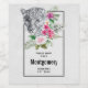 Las etiquetas personalizadas de las botellas con un bonito ilustracion con un retrato de leopardo gris, negro y blanco. Este encantador animal está rodeado por un ramo de flores tropicales. Elegante, exótico y encantador.