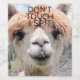Fotografía divertida, comedida, sonriente en la Alpaca Imagen con el texto que dice: "No toques - escupiendo". Las Llamas y las alpacas son animales dulces pero no dudarán en escupirte. La proximidad de una Alpaca de color beige, blanco y afeitado. Tiene una sonrisa por su armario, pero ¿se atreverá la gente a tocarlo? La Alpaca es similar a la llama, y a menudo confundida con ella. Hermosa fotografía de animales de granja domesticada. Una mujer usa este comportamiento para decirle a un hombre que no está interesado en sus avances, y ambos géneros lo usan para mantener a los competidores lejos de la comida. El escupir también se usa para advertir a un agresor de que se vaya. Algunas llamas y alpacas son más cangrejos que otras y escupen con poca provocación. Pero, la mayoría de ellos suelen dar una advertencia justa antes de descargar todo el arsenal.