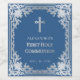 Este elegante diseño religioso azul y plateado con aire vintage, recomendado para un niño, tiene un marco ornamentado de lámina de plata falsa con decoraciones barrocas elegantes sobre un fondo azul clásico. Sobre el texto hay una cruz religiosa en lámina de plata falsa. La ocasión también está en lámina de plata falsa; el resto del texto tiene un color gris plateado similar al marco de plata falsa.