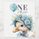 the story of a joyful milestone— very first birthday, a celebration wrapped in love, warmth, and a touch of whimsy. The design centers around a charming goose, lovingly illustrated as if plucked from the pages of a beloved children’s book. He’s not just any goose—He’s “one silly goose,” dressed for a party in a striped hat and floral crown, proudly clutching a Blue balloon. His expression is wide-eyed, innocent, and full of personality—just like a one-year-old discovering the world.