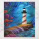 Hermoso faro de rayas rojas y blancas sobre un rocoso en el exterior rodeado de flores y agua azul/cielo Arte de IA creado por minx267