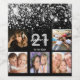 Para una fiesta de cumpleaños número 21 (o cualquier edad), celebrando su vida con un collage de 5 fotos propias. Personalice y agregue un nombre, edad 21 y fecha. Fecha de nacimiento o fecha del fiesta. Letras de color blanco y gris. Color del fondo negro clásico, decorado con polvo falso purpurina plateado