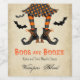 Una idea divertida para tu fiesta de Halloween, esta etiqueta de vino muestra una bruja caprichosa con medias a rayas y una falda de puntos de polka cayendo en la escena con murciélagos volando a su alrededor. Se añade un texto "Boos y Booze" audaz con un subtexto adicional que puede personalizarse con la redacción deseada. La cosecha de vino se muestra como "Sangre de vampiros". Esto puede editarse si desea utilizar otro texto. El gráfico de brujas adorables es original artwork©delightful-doodles.com.