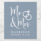 Elegantes y modas personalizados polvorientas etiquetas de botellas azules con "Mr & Mrs." escrito en un gran guión blanco y un ilustracion de dos anillos bodas se unieron. Agregue su nombre y fecha de boda.