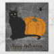 A spooky (but cute!) Halloween design featuring a black cat, a spider and a pumpkin over a chalkboard background.