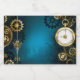 Fondo turquesa, texturado, steampunk con bronce y engranajes dorados, llave de plata y reloj. Estilo Steampunk.