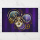 Araña de acero de oro y acero con relojes antiguos decorados con artes dorados sobre el fondo morado, rayado, texturado con lentes y engranajes de latón. Estilo Steampunk.