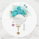Llave de oro antiguo con rosas turquesa de moda decorados con hojas de oro blanco y cuentas rosas y azules. Color de moda. Rosas turquesas. Oro blanco. Tifanía azul.