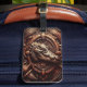 Una vista de primer plano de la cabeza de un lagarto tallado, rodeado de patrones y texturas intrincadas, creando una sensación de poder y misterio.