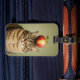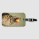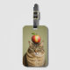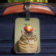 Un gato gracioso con una manzana balanceándose encima de su cabeza.