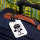 Una elegante etiqueta para equipaje blanca con un diseño floral negro estilizado y moderno con pétalos y tallos abstractos, sobre un fondo sutil de lágrima de lavanda. Debajo de la flor, el nombre "SANDRA" está impreso en letras artísticas y negritas, lo que la convierte en una accesorio personalizado y elegante.