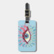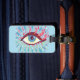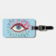 Etiqueta personalizada psicodélica del equipaje de los ojos con un ilustracion colorido de un extraño ojo azul con grandes pestañas rosadas curvadas, lágrimas azul claro fluyendo por todas partes y muchos elementos rosados y verdes - extensiones de las pestañas. Esta etiqueta de equipaje tiene el nombre del personalizable, la dirección y el número de teléfono en la parte posterior.
