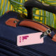 Etiqueta para el equipaje con tu monograma inicial en una letra grande y negrita y tu nombre a continuación. Texto de Borgoña sobre un fondo rosado. Los colores son personalizable en la herramienta de diseño. Añade tu información de contacto en la parte posterior.