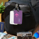 Una elegante etiqueta para el equipaje con la imagen gráfica de un avión rosa en color púrpura (color personalizado), para identificar sus pertenencias en el aeropuerto