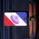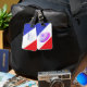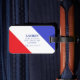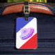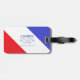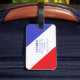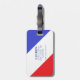 Etiqueta de equipaje con un platillo volador y texto|"Bon Voyage" que se puede personalizar. Este platillo volador tiene rayas azules blancas y rojas como fondo. Destacar de la multitud con esta encantadora etiqueta de lugagge de la próxima generación.