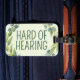 This luggage tag features the slogan 'Hard of Hearing' in a thin font, surrounded by a wreath of eucalyptus leaves, on a pale green background. You can edit the text as needed. 🍃 For more useful deafness accessories, visit my store Zazzle.com/Elder_Vitality 🍃 For custom orders, message me on Zazzle