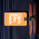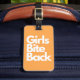 ¡PONTE DE PIE! Etiquetas de maletas "Chicas Bite Back" adorables con el color blanco sobre un fondo naranja brillante. Dimensiones: 2"l x 3.5" w (tamaño estándar de la tarjeta de visita) Fabricado con correa de equipaje de cuero acrílico resistente a los rayos UV y impermeable incluida Impresa en ambos lados