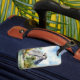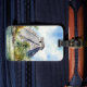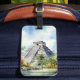 Bonita etiqueta de equipaje con Chichen Itza, México. Hermosa pirámide pintada de El Castillo, ruinas del Imperio Maya.