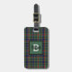 Bonita etiqueta para el equipaje de plástico hecho en el colorido patrón tradicional escocés de escocés Bisset tartan. Un área de texto verde, en el frente central, tiene un monograma blanco de una sola letra y un nombre negro listo para personalizar. La parte posterior de la etiqueta es verde sólido con texto informativo hecho en blanco.